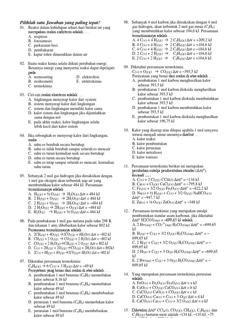 Pembakaran 1 mol gas etena membentuk karbon dioksida dan uap air menghasilkan 142 kj.