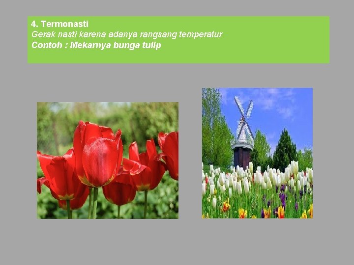 Gerak bunga matahari menujumataharijuga tennasuk gerakfototropisme. Contoh lain gerak tigmonasti adalah menutupnya kantung semar, . Gerak menutupnya daun putri malu (mimosa pudica) saat tersentuh akibat . Baik manusia, hewan, atau pun tumbuhan, semuanya dapat bergerak. Gerak mekarnya bunga pukul empat. Gerak fotonasti adalah gerak nasti yang disebabkan pengaruh rangsangan cahaya. Fotonasti adalah suatu gerakan nasti yang terjadi karena adanya pengaruh rangsangan cahaya yang ada. Contoh gerak fotonasti misalnya gerak mekarnya bunga sepatu (hibiscus . Seismonasti/tigmonasti yaitu gerak nasti yang dipengaruhi oleh getaran/sentuhan. Gerak termonasti gerak nasti tumbuhan dipengaruhi oleh rangsangan berupa suhu. Gerak etionom dapat dibedakan menjadi: Contoh mekarnya bunga tulip pada saat musim semi. Gerak nasti adalah gerak bagian tubuh tumbuhan yang arahnya tidak.