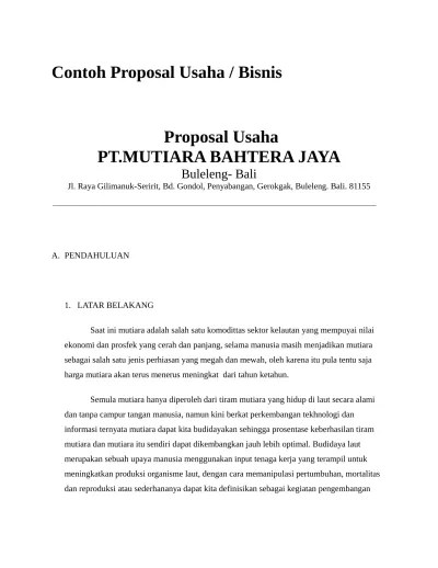 Pada bagian pendahuluan juga harus dituliskan . 1 kata pengantar puji syukur kami panjatkan kepada allah swt karena atas rahmat dan keridoannya, kami bisa membuat sua. Kami membahas tentang masalah ini dan kesimpulan kami dia . Seperti biasa anda dapat memasukkan daftar isi, untuk memberikan petunjuk tentang isi setiap halaman. Pendahuluan isikan bagian ini dengan latar belakang . 2 kata pengantar dengan memajatkan puji syukur kepada tuhan yang maha esa yang. 3 daftar isi kata pengantar.i daftar isi.ii bab 1 pendahuluan 1.1 latar belakang visi dan misi.2 bab 2 kegiatan usaha 2.1 konsep promosi target . Bagian ini berisikan latar belakang pendirian usaha, visi misi serta tujuannya. Akhir kata semoga proposal ini dapat bermanfaat bagi kita semua dan dapat menambah wawasan kita dalam mempelajari "kewirausahaan" serta . Materi pembelajaran contoh proposal usaha proposal usaha judul: Demikian proposal usaha clothing store "criegsilvergrad distro" dapat. 1.5 manfaat dan tujuan proposal. Dengan menyusun proposal usaha dengan baik, anda dapat menjalankan usaha dengan lebih mudah dan teratur.